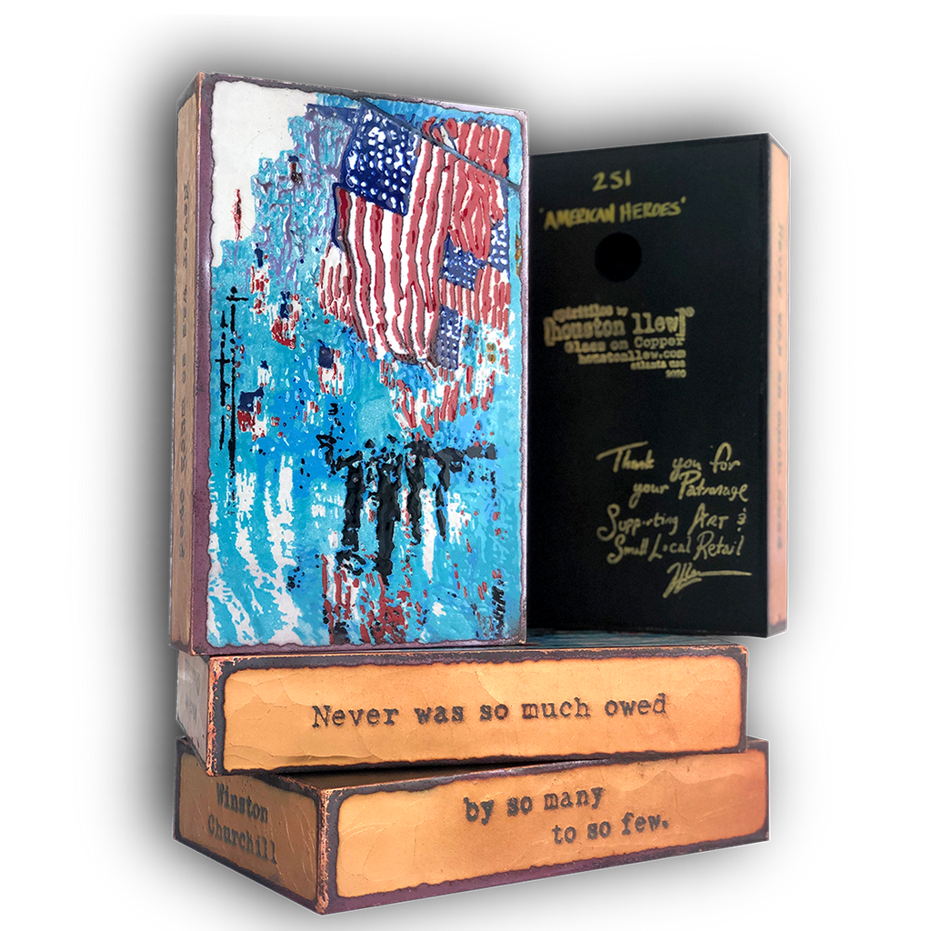 "Never was so much owed by so many to so few".. Winston Churchill. This spiritile is dedicated to all American Heroes, From front line workers to our veterans, our doctors and nurses and our fearless leaders. We are eternally grateful for your sacrifices. Houston Llew's inspiration is a 1917 painting "Avenue in the Rain". The original painting is in the permanent art collection of the White House and has graced the Oval Office over several recent presidencies. Now through Labor Day, Houston is donating a portion of proceeds from each Spiritile to the Gary Sinise Foundation's Emergency COVID-19 fund providing grants to first responders in need of personal protective equipment, financial assistance to healthcare professionals, service members, veterans, and families who have been impacted.